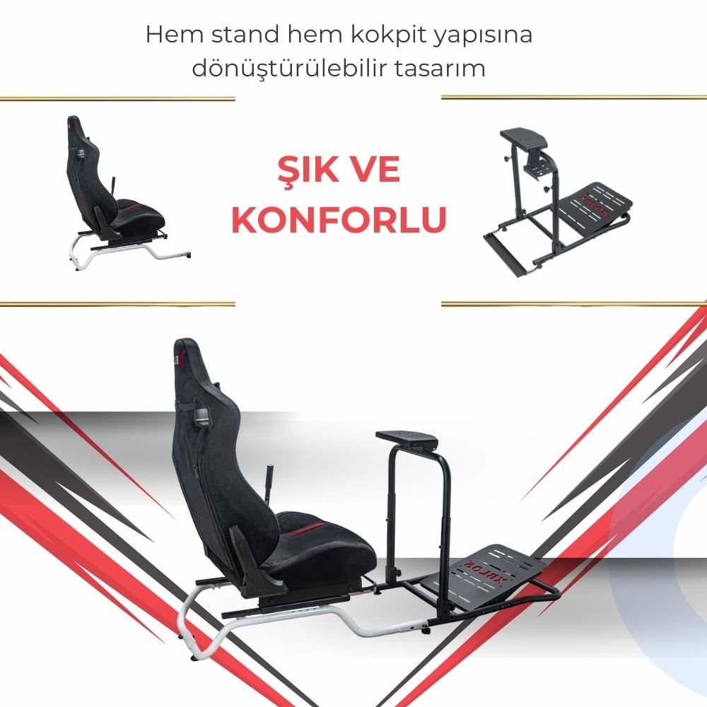 Sürükleyici bir yarış keyfi sunmak için farklı direksiyon tabanları, pedal setleri ve vites modülleriyle uyumlu; ayarlanabilir ergonomik koltuk yapısı ve entegre kızak sistemiyle kompakt bir tasarım sunar.